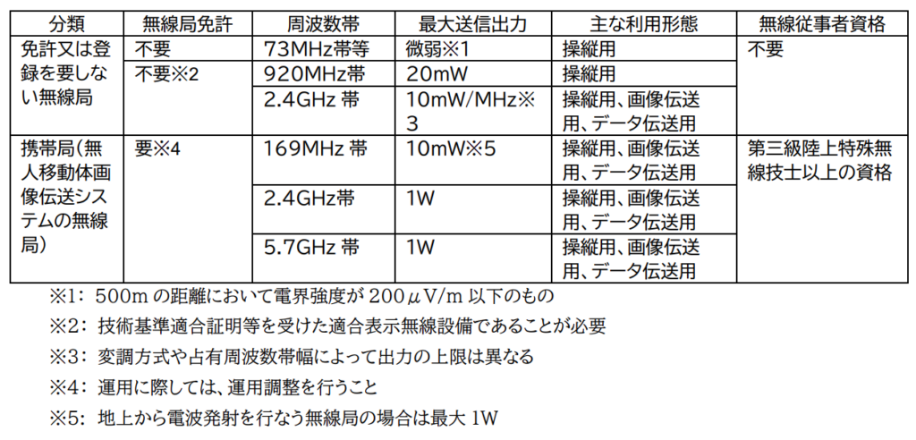発射する電波が極めて微弱な無線局や、一定の技術的条件に適合する無線設備を使用する小電力の無線局については、無線局の免許又は登録が不要である。無人航空機には、ラジコン用の微弱無線局や小電力データ通信システム(無線 LAN 等)の一部が主として用いられている。